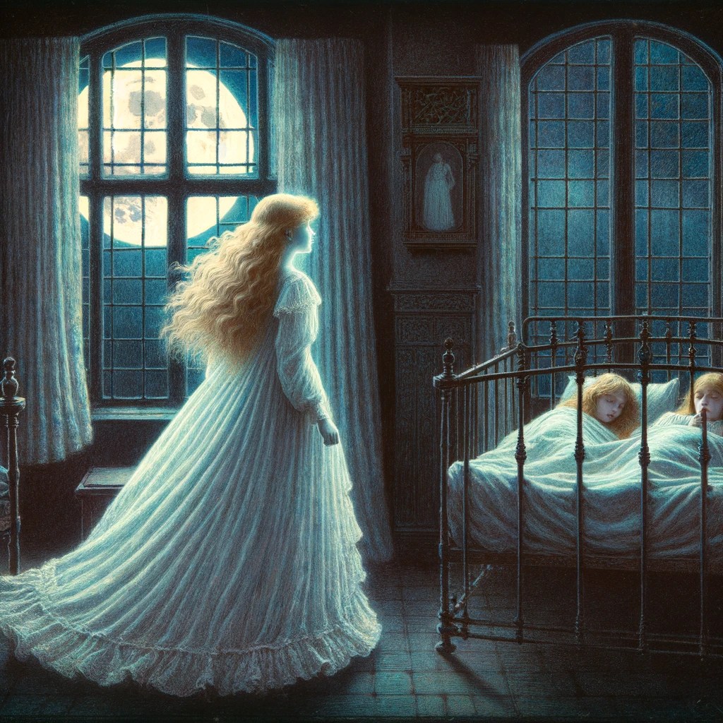 Una dintre surorile mai mici ale bunicii mele, mătușa Leontina, a cărei mână stângă fusese paralizată de poliomielită, o vizita adesea la conac, și rămânea peste noapte. Într-o seară, în timp ce sora ei părea că doarme adânc, bunica simți o lumină neobișnuită în cameră. Deschise ochii și ceea ce văzu o înmărmuri: o fată luminoasă, angelică, cu părul lung, blond, ondulat, îmbrăcată în ceea ce părea o rochie albă ca de mireasă, o privea de aproape. Închise ochii la loc, încremenită de frică, neîndrăznind nici să respire, și își făcu cruce cu limba în gură. Învinsă totuși de curiozitate, și poate și din instinct de conservare, își deschise din nou ochii. Fata era acum lângă patul surorii ei, atingându-i, parcă, mâna paralizată. „Tu Viorică, ce vrei? Lasă-mi mâna în pace, bată-te Dumnezo!” blestemă prin somn sora ei, fără să deschidă ochii, crezând că era bunica. În acel moment, fantoma dădu înapoi și dispăru printre gratiile ferestrei.